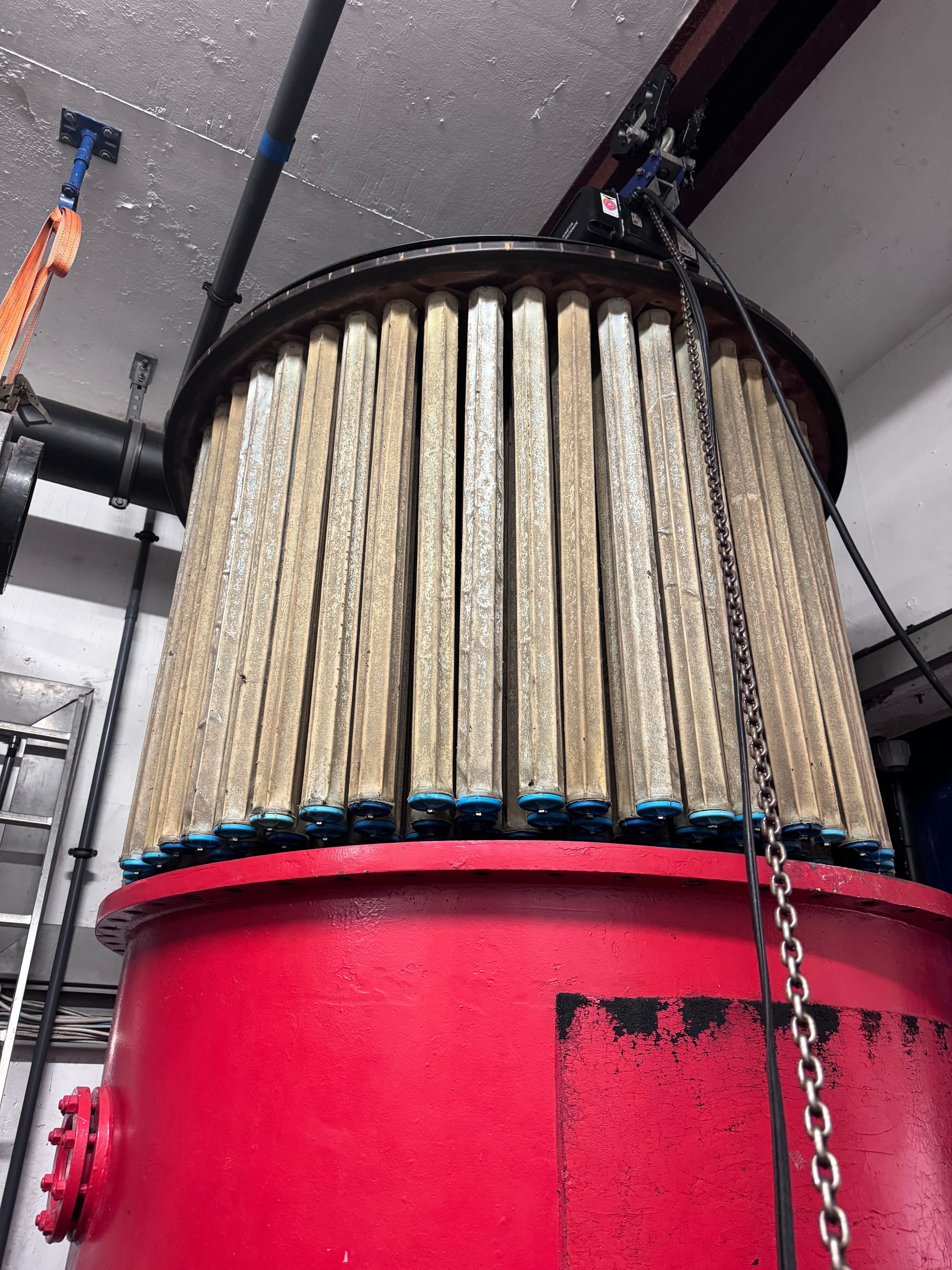 Da drin stecken viele lange Filterkerzen. Um genau zu sein in diesem auf dem Foto 254 Stück. Stellt euch das wie ganz viele Staubsaugerbeutel nebeneinander vor. Das Wasser führt mittels Pumpen in den Filter gedrückt. Auf diesen Filterkerzen ist das Filtermaterial angesiedelt. Eine Mischung aus Kieselguhr und Aktivkohle. Dies ist die Filterschicht. Durch diese Filterschicht muss Wasser durch und gelangt von da aus in die Filtratkammer. Bei diesem Vorgang haften sich Schmutzpartikel an dieser Filterschicht an.