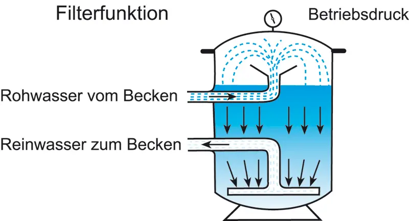 Bei einer Filter Rückspülung, die einmal die Woche stattfindet, wird das belastete Filtermaterial ausgespült und neues Filtermaterial angeschwemmt. Bei einem mehrschichtig oder ein Schichtfilter wird das Filtermaterial nicht aus geschwemmt, sondern nur durch eine Luft/Wasserspülung gereinigt. Hier wird dann nur der dreckige Wasser in den Kanal geleitet.